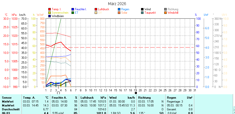 | Die dargestellten Werte repräsentieren die Daten der letzten 24 Stunden! Der Luftdruck ist auf Meereshöhe bezogen! |